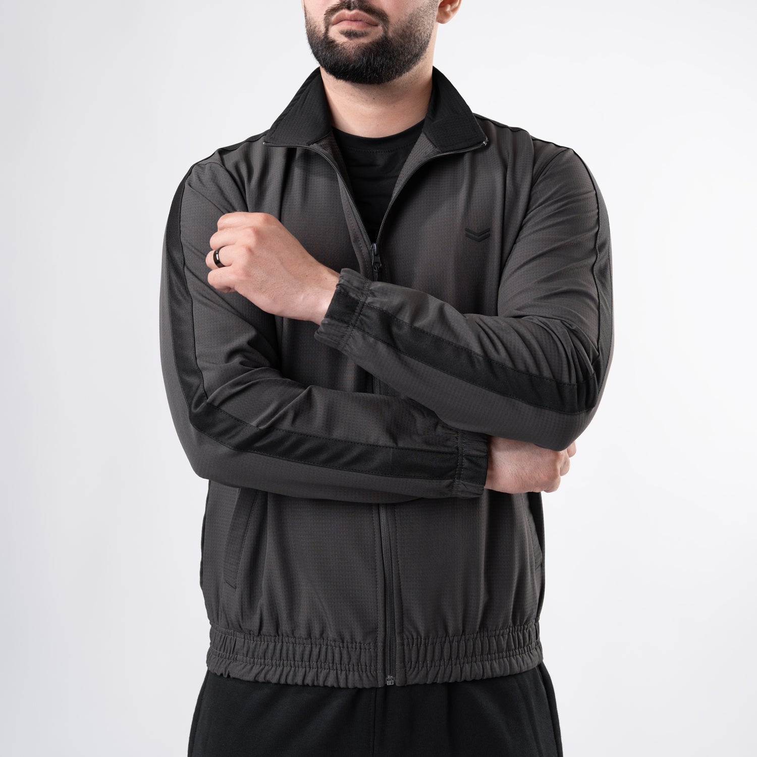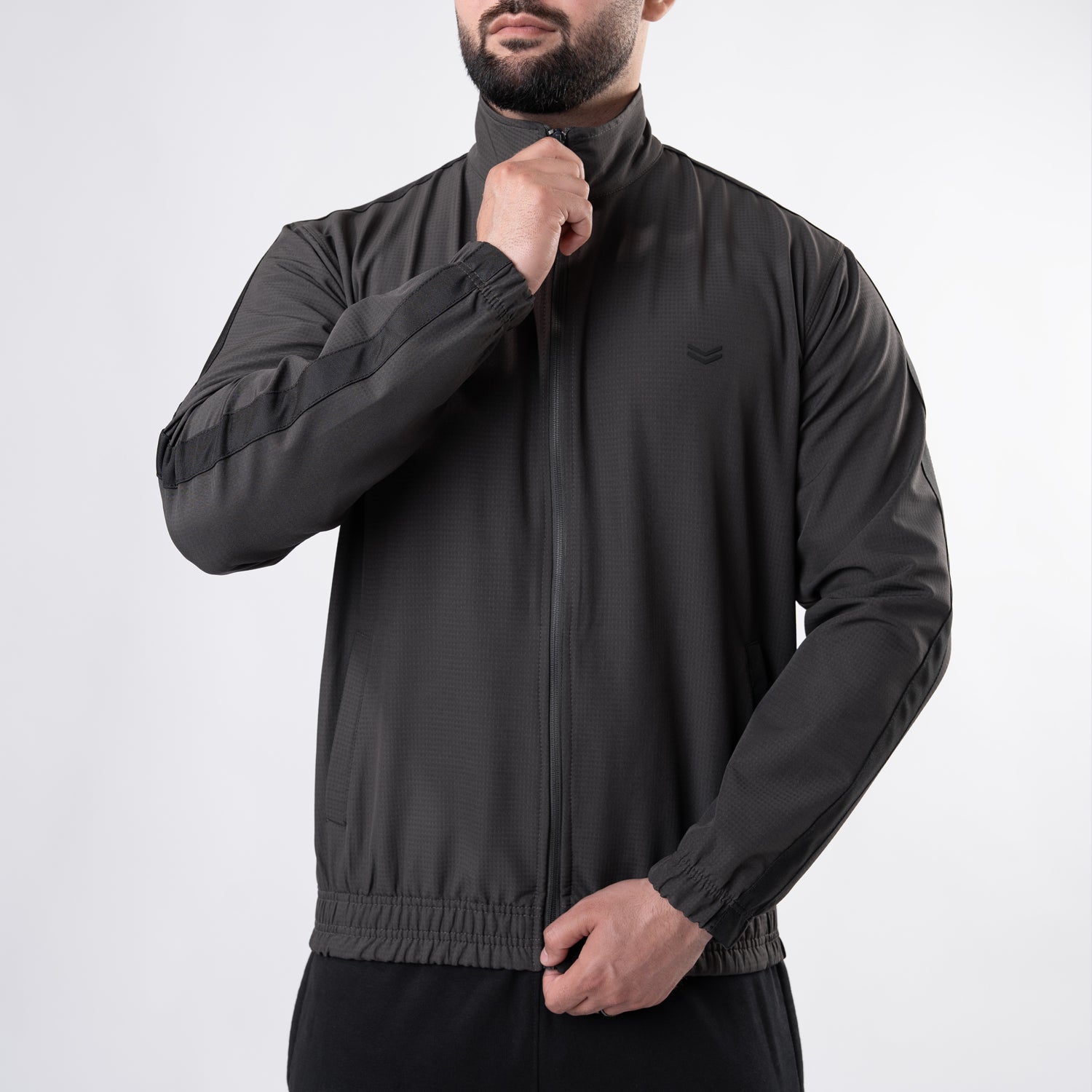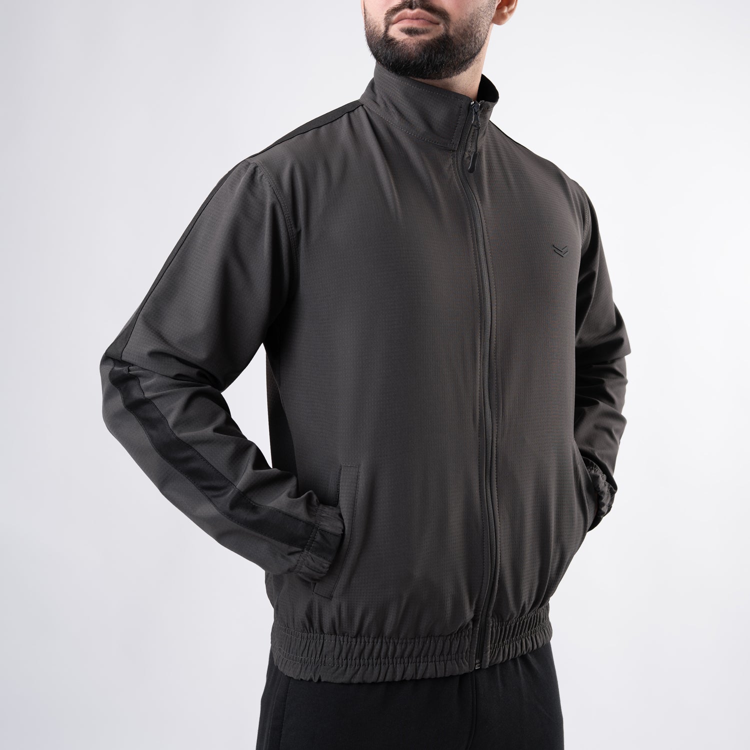 Dark Gray Woven Lycra Mock-Neck Jacket with Black Panels